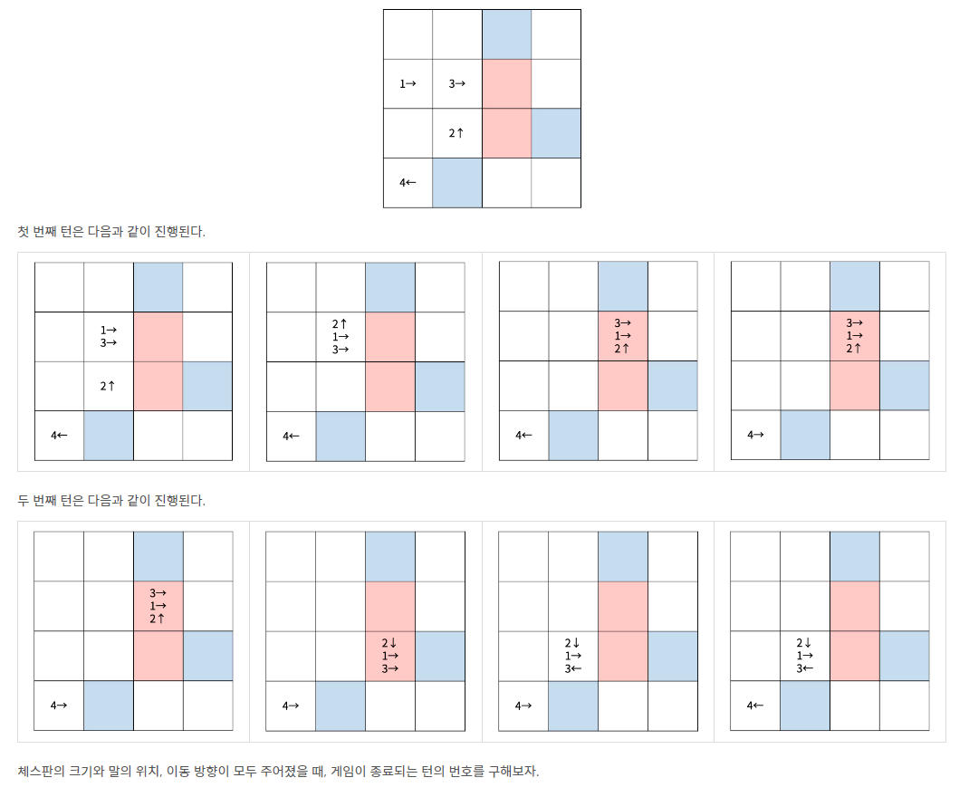 체스판의 크기와 말의 위치, 이동 방향이 모두 주어졌을 때, 게임이 종료되는 턴의 번호를 구해보자.