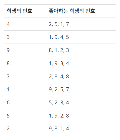 학생의 번호는 중복되지 않으며, 어떤 학생이 좋아하는 학생 4명은 모두 다른 학생으로 이루어져 있다. 입력으로 주어지는 학생의 번호, 좋아하는 학생의 번호는 N2보다 작거나 같은 자연수이다. 어떤 학생이 자기 자신을 좋아하는 경우는 없다.