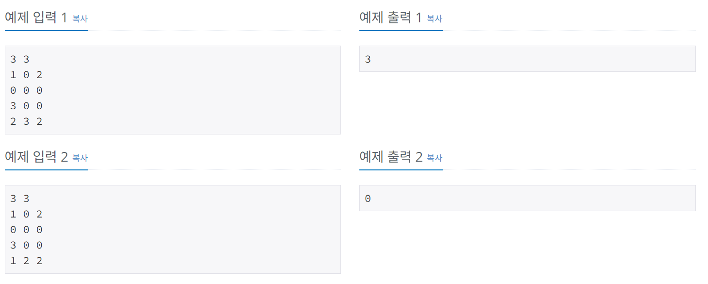 첫째 줄에 자연수 N, K가 공백을 기준으로 구분되어 주어진다. (1 ≤ N ≤ 200, 1 ≤ K ≤ 1,000) 둘째 줄부터 N개의 줄에 걸쳐서 시험관의 정보가 주어진다. 각 행은 N개의 원소로 구성되며, 해당 위치에 존재하는 바이러스의 번호가 공백을 기준으로 구분되어 주어진다. 단, 해당 위치에 바이러스가 존재하지 않는 경우 0이 주어진다. 또한 모든 바이러스의 번호는 K이하의 자연수로만 주어진다. N+2번째 줄에는 S, X, Y가 공백을 기준으로 구분되어 주어진다. (0 ≤ S ≤ 10,000, 1 ≤ X, Y ≤ N)